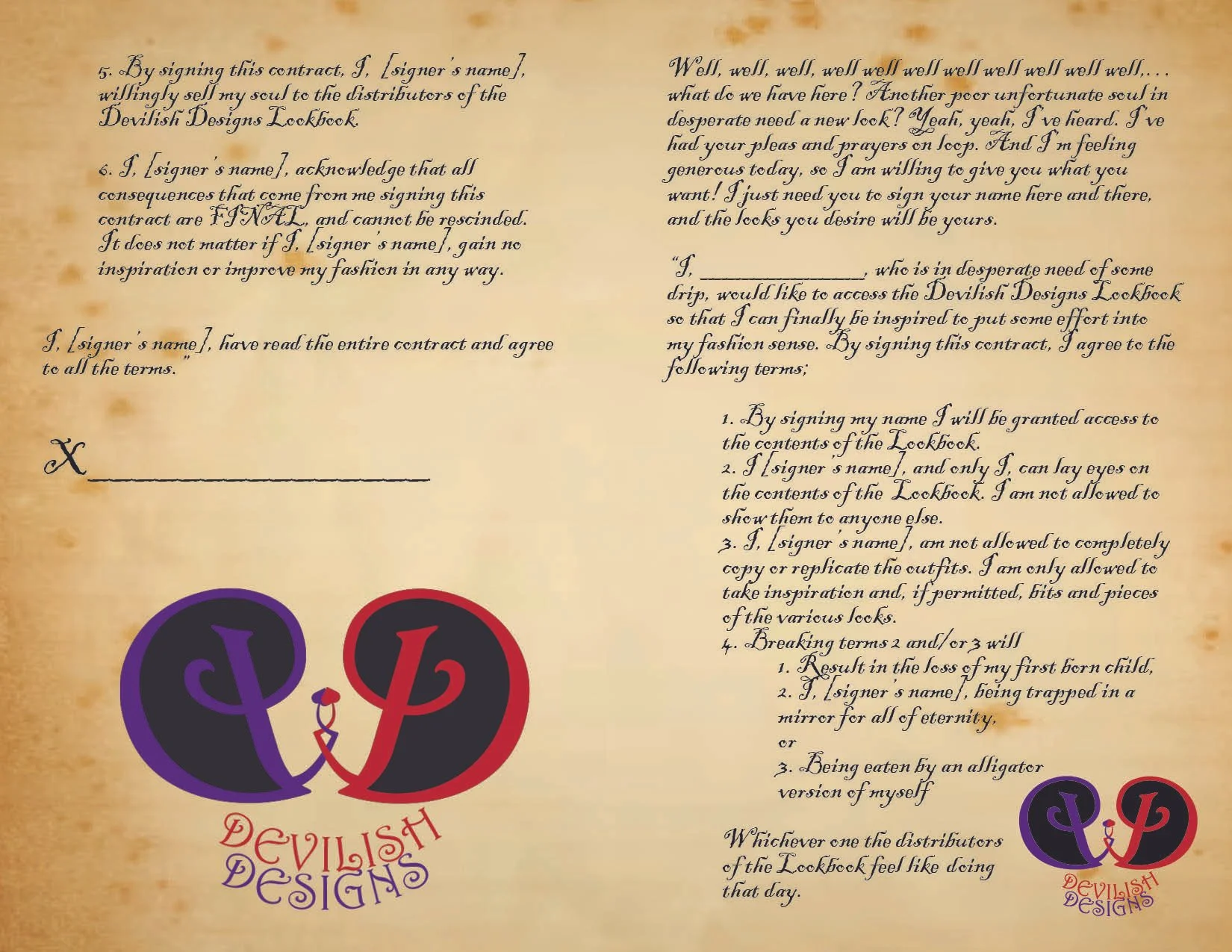 Many of the villains we chose are “deal makers,” or offer something too good to be true to their victims, so for my lookbook’s concept, I wanted it to be like a contract that the reader would sign (including agreeing to sell their soul) in order to gain access to the fashion looks. The front and back cover is the contract, and I included more references to many of the villains.