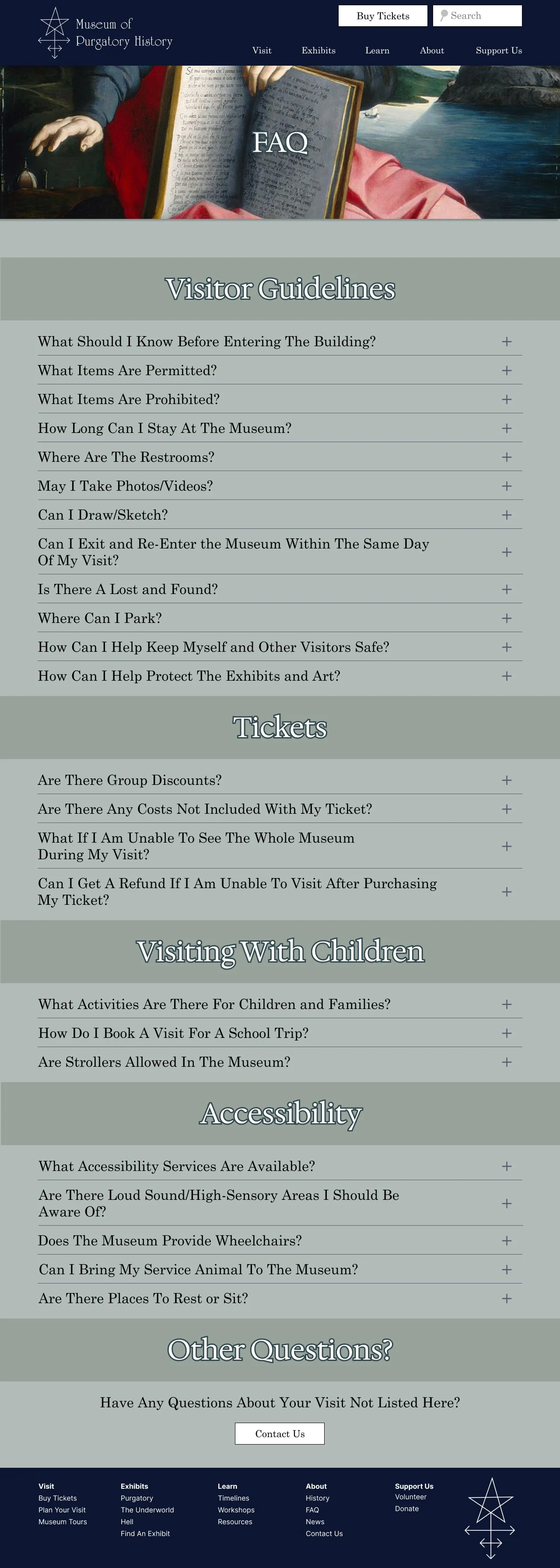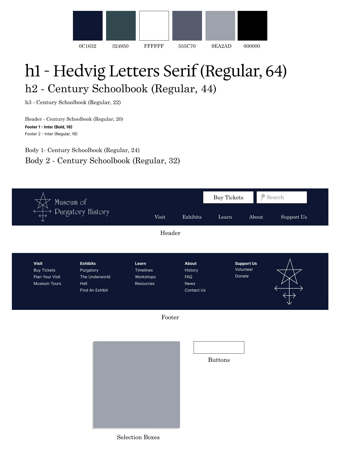 I interviewed people already interested in Purgatory/Underworld/Hell, frequent museum goers, and occasional museum goers on what interests them about purgatory, as well as what they like/dislike in a website. I created a sitemap with five main braches: Visit, Collections, Learn, About, and Contact.